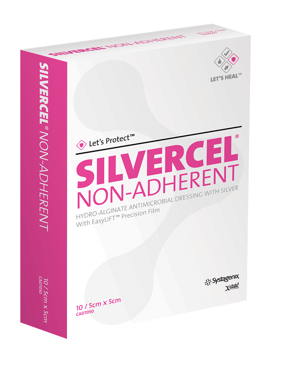 SILVERCEL™ NON-ADHERENT Hydro-Alginate Antimicrobial Dressing is a non-woven pad composed of alginate, carboxymethylcellulose (CMC) and silver coated nylon fibres, with a non-adherent wound contact layer.