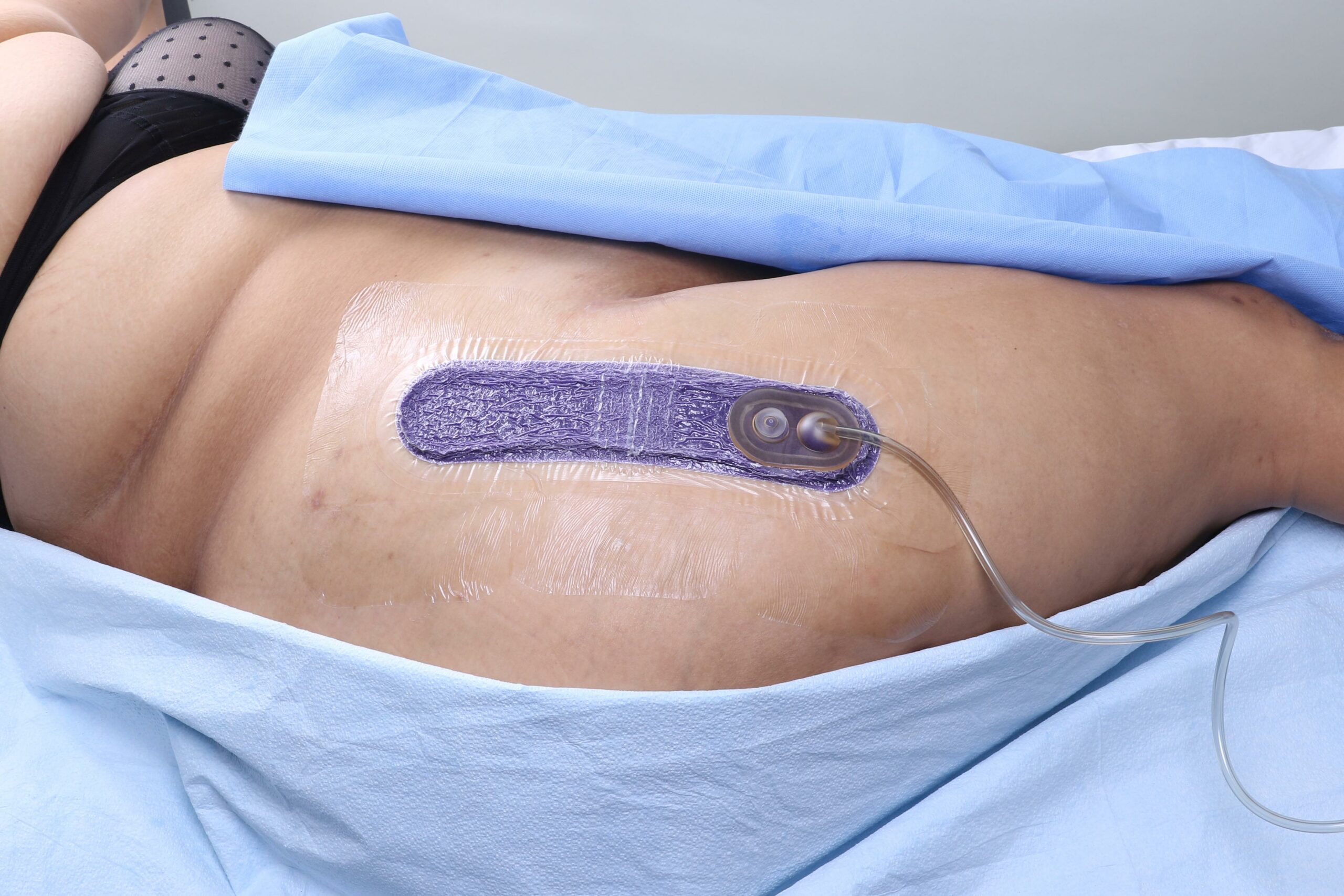 Sous une pression négative continue de 125 mmHg, le pansement en mousse à cellules ouvertes en forme de filet se courbe et s’affaisse. Cela rapproche les bords de l’incision et améliore la gestion des fluides.