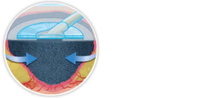 In vitro/in vivo-onderzoeken tonen aan dat foamcontact met weefsel microdeformatie veroorzaakt die leidt tot celrek.3 Celrek onder negatieve druk stimuleert cellulaire activiteit die resulteert in vorming van granulatieweefsel.4-5 Bij daaropvolgende verbandwisselingen vult het granulatieweefsel het wondbed, waardoor het volume verder wordt verminderd en het wordt voorbereid op definitieve sluiting.