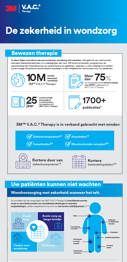 Sinds de introductie in 1995 is V.A.C.® Therapie wereldwijd meer dan 10 miljoen keer geselecteerd om wonden te behandelen (6). Meer dan 75% van het gepubliceerde klinische bewijs van NPWT is gebaseerd op 3M V.A.C.® Therapie.