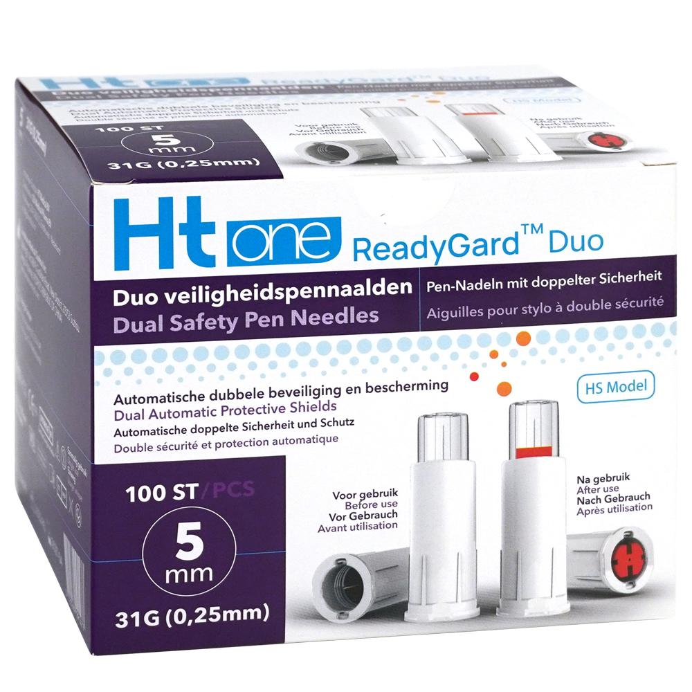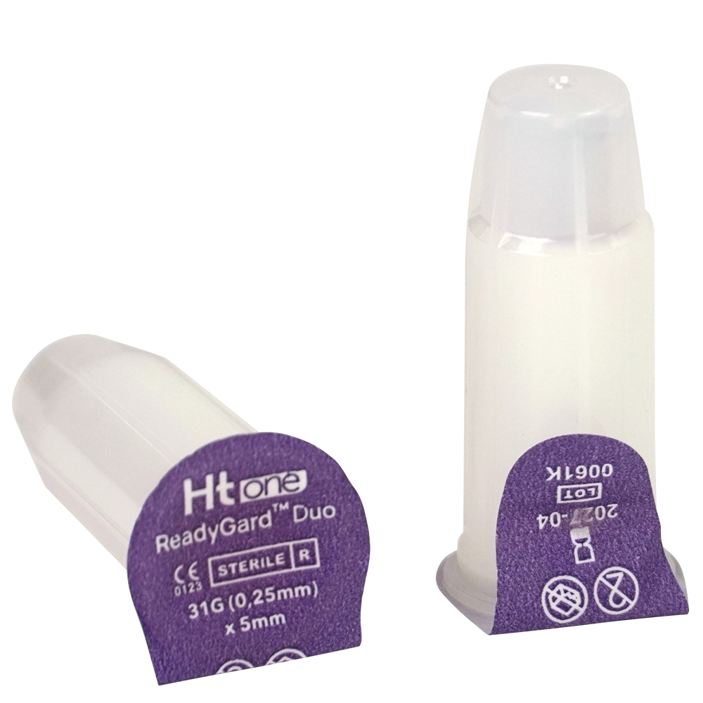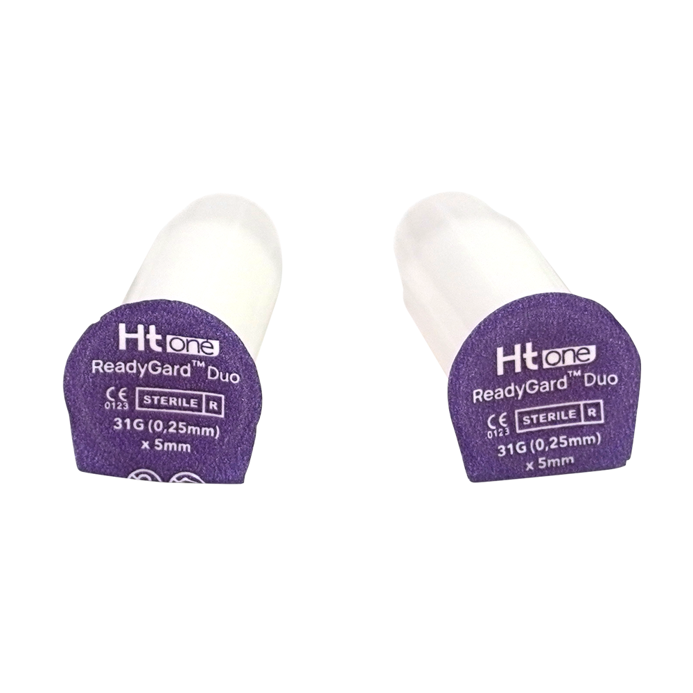 Ht One ReadyGard Duo veiligheidspennaald kan worden gebruikt met de meest gangbare insulinepennen en is beschikbaar in de maatvoering 31G/5mm,