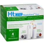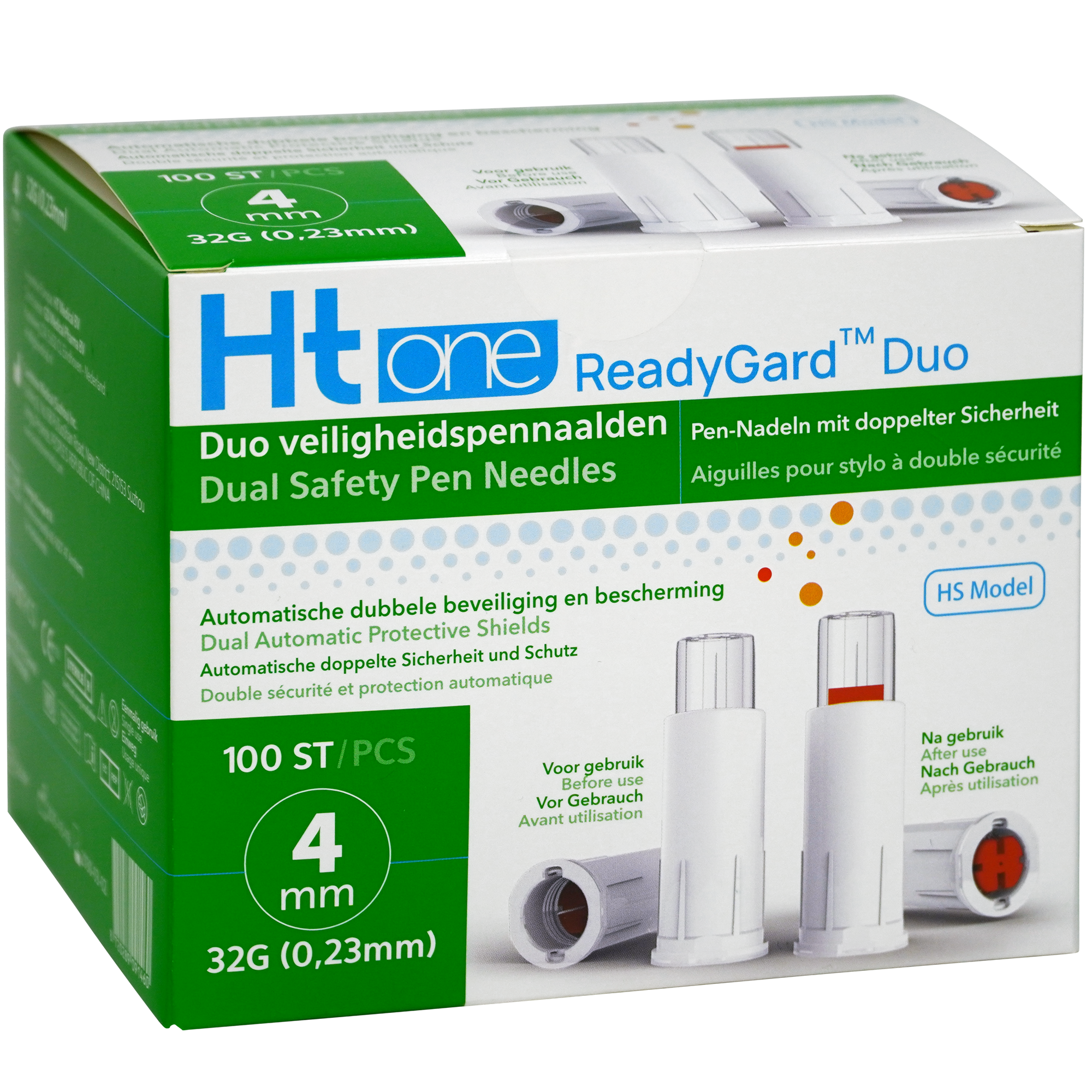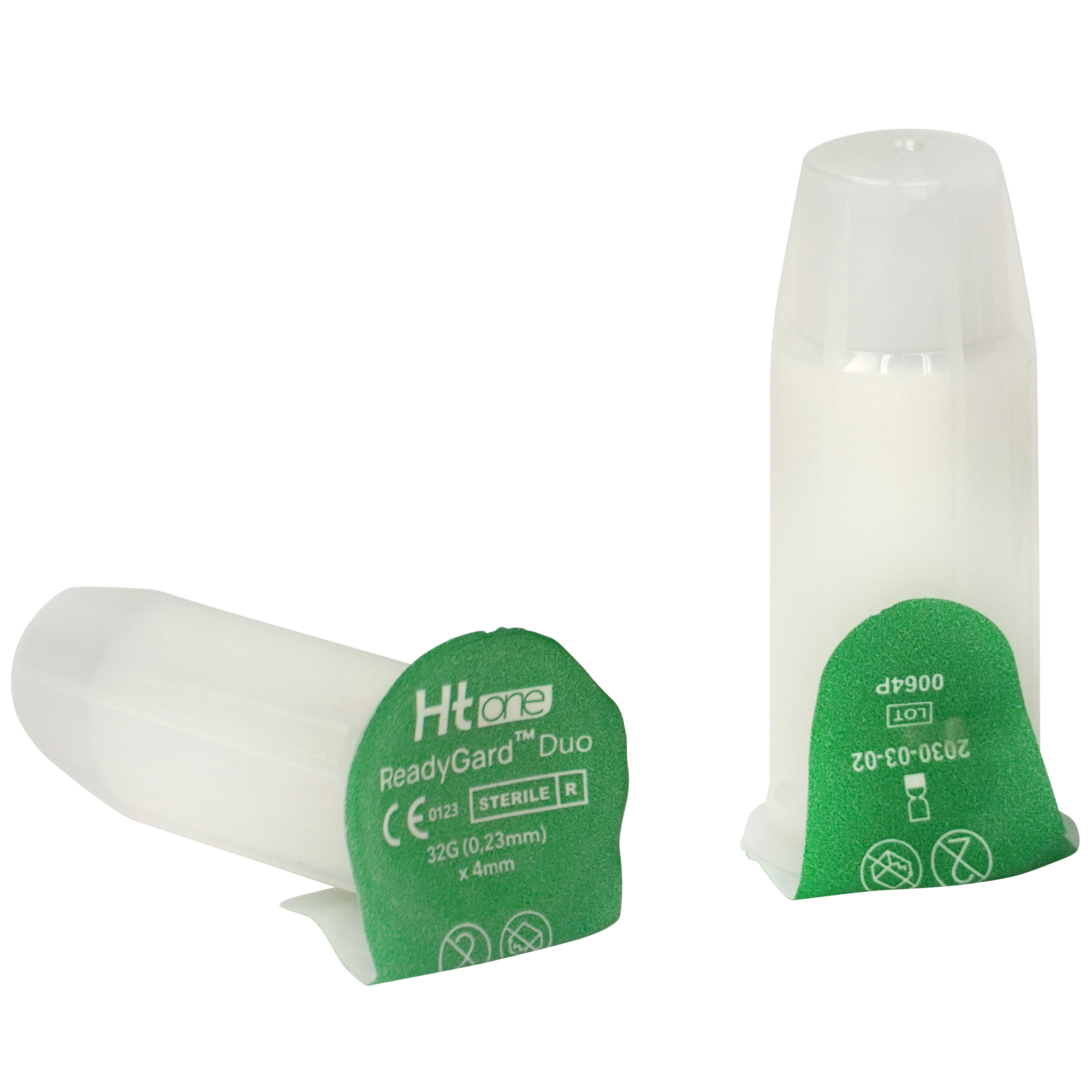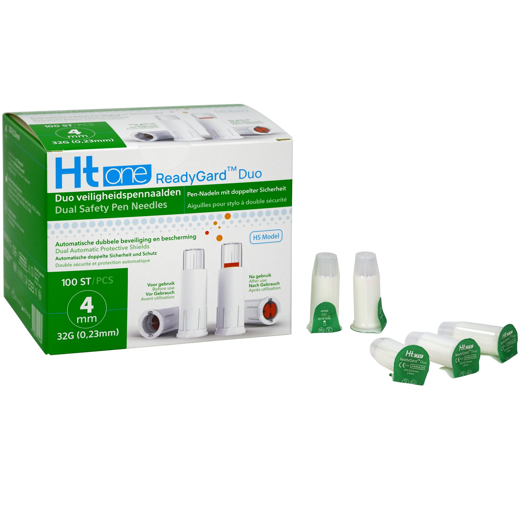 Ht One ReadyGard Duo veiligheidspennaalden kunnen worden gebruikt met de meest gangbare insulinepennen en zijn beschikbaar in de maatvoeringen 31G/5mm en 32G/4mm. In een verpakking zitten 100 stuks.