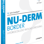 NU-DERM™ Border: Dit veelzijdige verband heeft een toplaag van semipermeabele, niet-schurende polyurethaanfolie en aflopende randen rondom. Ook de rand zelf bestaat uit huidvriendelijk zelfklevend hydrocolloïd materiaal.