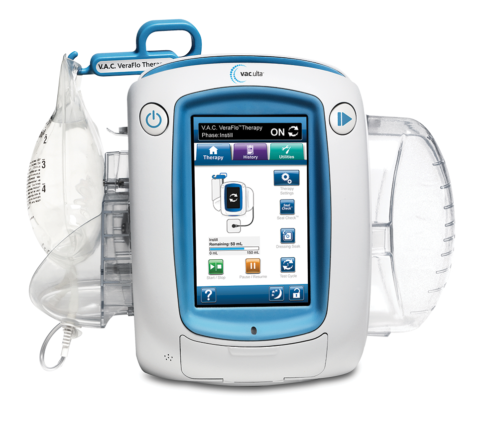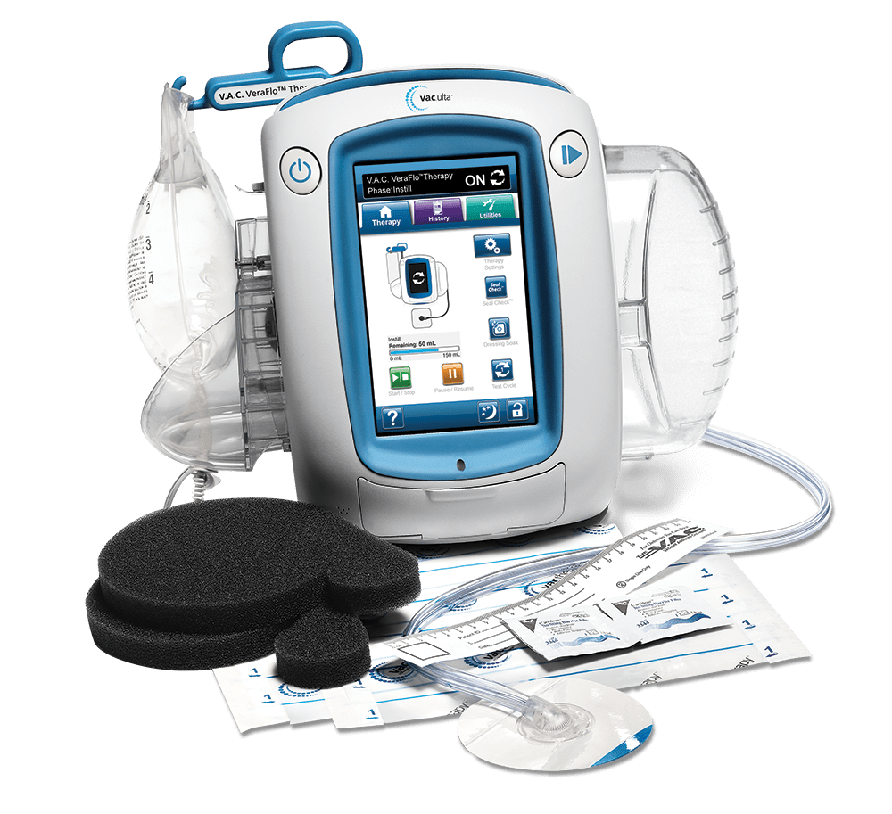 3M™ Veraflo™ Therapy is een combinatie van de voordelen van 3M™ V.A.C.® Therapy met optie van instillatie: door een automatische volumetrische toediening van lokale wondbehandelingsvloeistoffen en een programmeerbare inweekinstelling wordt de vloeistof in staat gesteld in de wond te blijven voor grondig contact.
